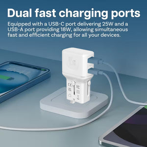منفذان بقدرة 25 واط + 20 واط (وليس 18 واط مثل الشواحن الرخيصة) — اشحن MacBook Air و iPhone بكامل السرعة.