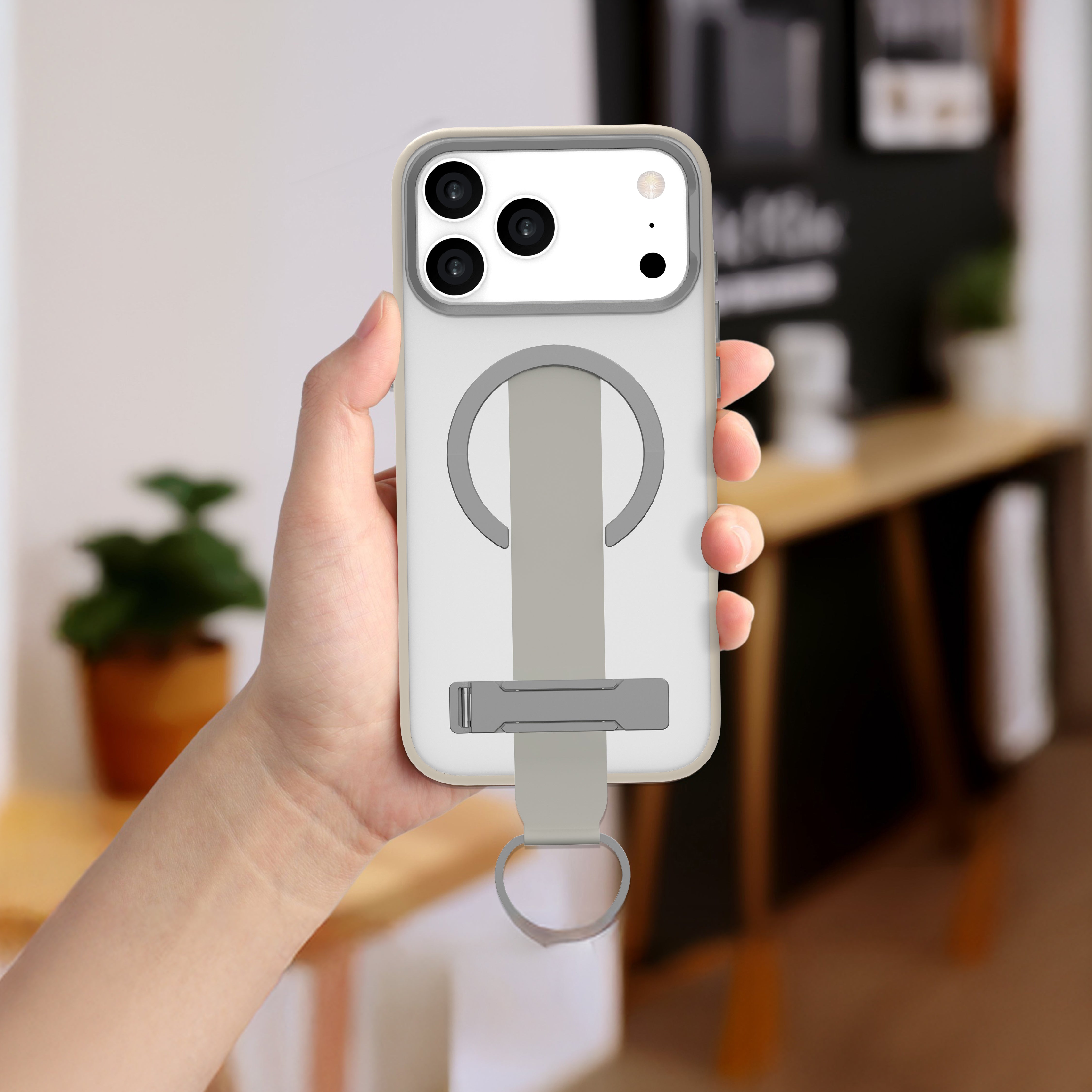 The case features a stretchable silicone grip strap that provides a secure and relaxed one-handed grip. Constructed from high-quality, flexible silicone, it is both durable and washable. With full compatibility with wireless charging, an integrated foldable metal kickstand for multi-angle viewing, and a sturdy metal D-ring for extra portability, this case is a comprehensive and reliable solution.