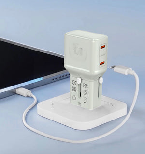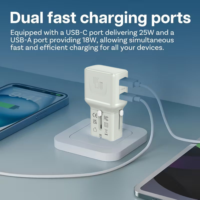 Stop juggling 3 chargers and adapters for your phone, laptop, and camera. The TravelPro Series delivers 45W of lightning-fast, dual-device charging in a palm-sized package that works in 195+ countries — no extra adapters, no bulky bricks. Finally, travel with one charger that does it all.